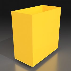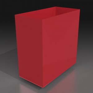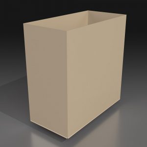 For å kunne stable eller koble kassene sammen, har kassene er liten flensekant i bunnen. Denne kanten stikker utenfor kassenes grunnform. Denne kassens bruttomål er L50,1x D25,1- H50,2cm (inkludert flensekanten).